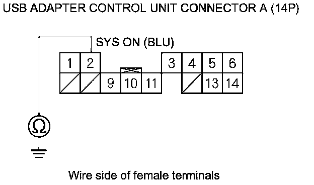 21. Check for continuity between USB adapter control unit connector A (14P) terminal No. 2 and body ground.