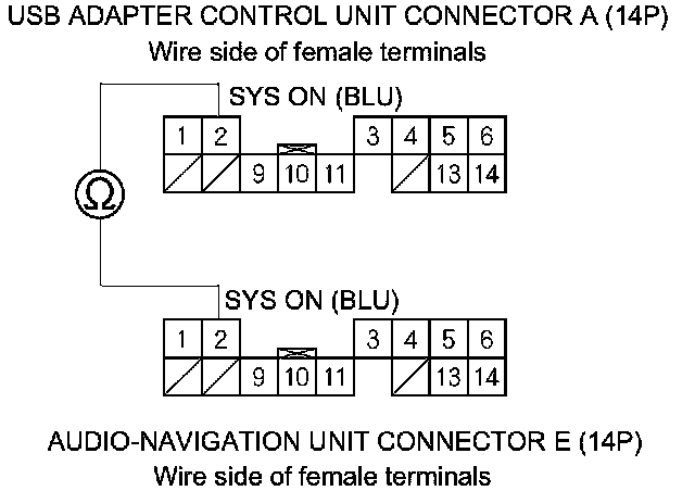 18. Check for continuity between USB adapter control unit connector A (14P) terminal No. 2 and audio-navigation unit connector E (14P) terminal No. 2.