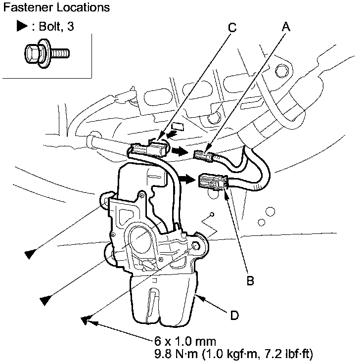 2. Disconnect the hatch latch switch connector (A) and the hatch release actuator connector (B), and detach the connector clip (C), then remove the bolts securing the hatch latch (D) from the hatch.
