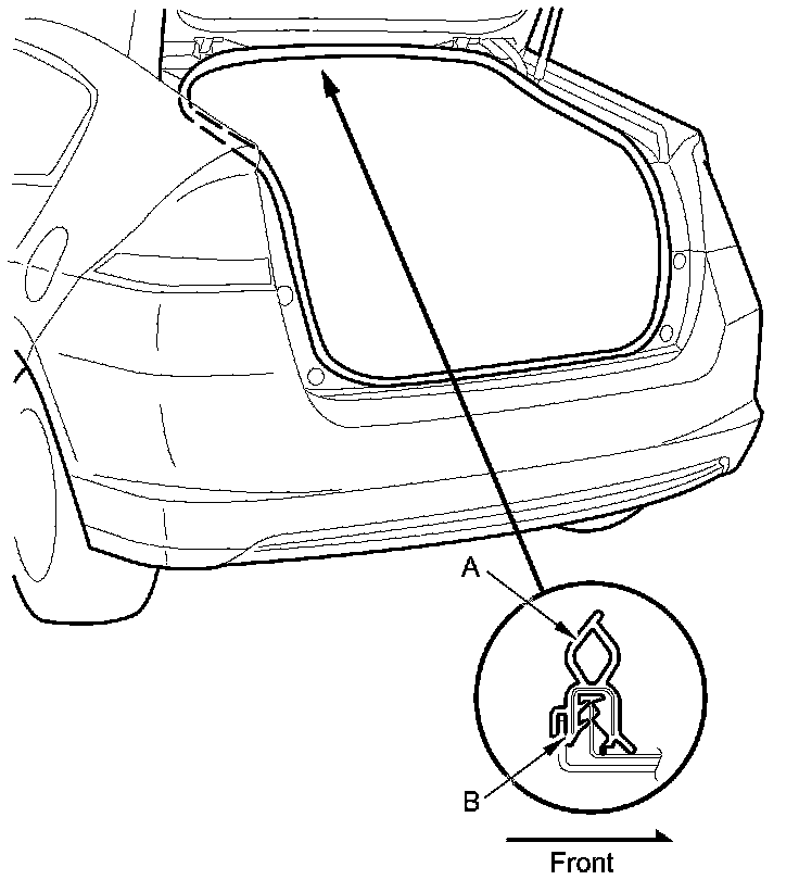 2. Locate the painted alignment mark (B) on the hatch weatherstrip. Align the painted mark with the alignment tab in the center of the hatch opening, and install the hatch weatherstrip all the way around.
