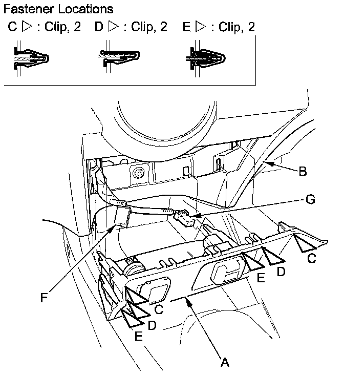 1. Use the trim tool to pry the gap between the dashboard (B) and the upper side of the center lower trim partially out and release the clips (C, D, E).