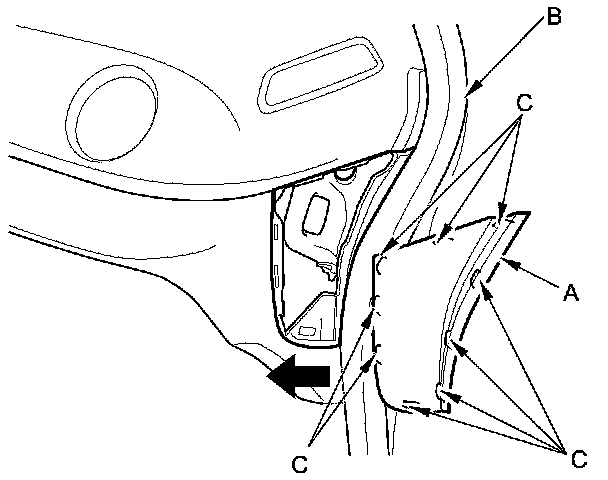 2. Gently pry the rear edge of the panel with the appropriate trim tool to detach the hooks (C).