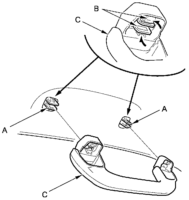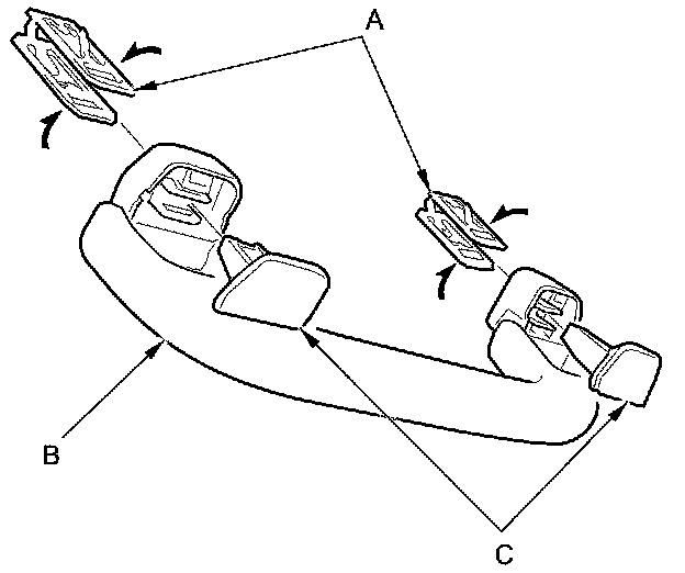 7. Install the clips (A) on the grab handle (B), then install the caps (C) fully into the clips.