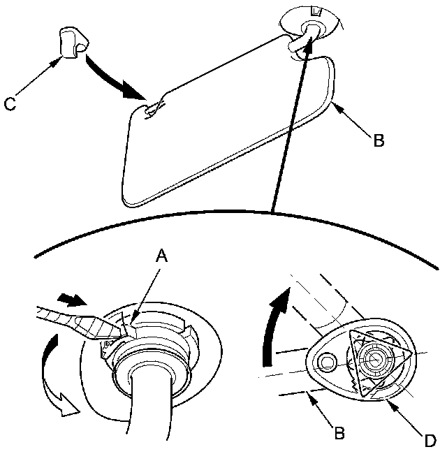2. While pushing in the hook (A) with the flat-tip screwdriver, release the sunvisor (B) from the holder (C), and rotate the sunvisor backward about 45 °. Make sure the hook slides into the bracket cover (D) as you rotate the sunvisor.