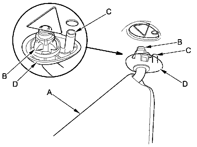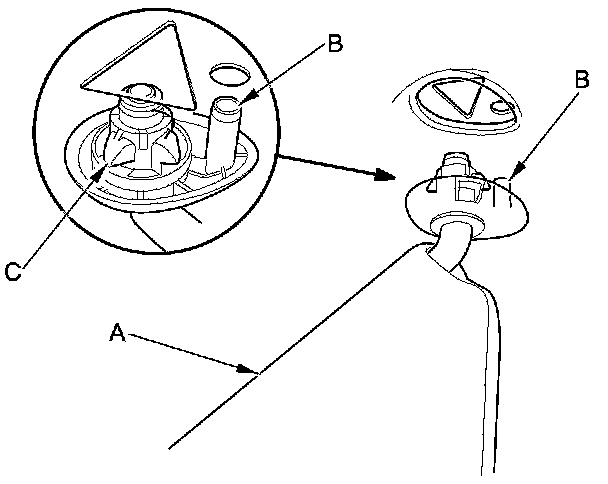 9. Install the holder (A) to the holder grommet (B) by turning it 45 ° clockwise, and install them to the body as an assembly by pushing it until the hooks (C) snap into place securely.