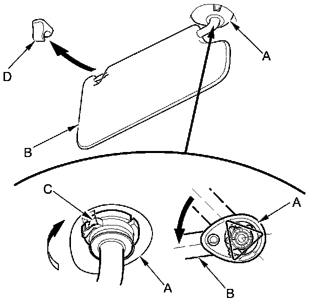 11. While holding the bracket cover (A), rotate the sunvisor (B) forward until the hook (C) snaps into place. Gently pull down on the sunvisor to make sure it is properly secured in the body. Rotate the sunvisor into the holder (D).