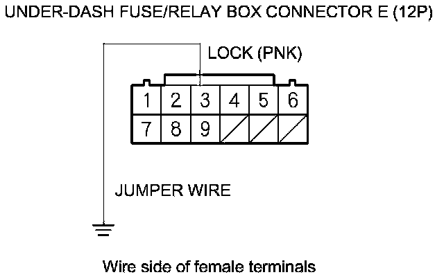 8. Connect under-dash fuse/relay box connector E (12P) terminal No. 3 and body ground with a jumper wire.