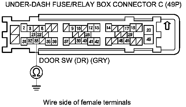 8. Check for continuity between under-dash fuse/relay box connector C (49P) terminal No. 33 and body ground.