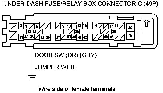12. Connect under-dash fuse/relay box connector C (49P) terminal No. 33 and body ground with a jumper wire.