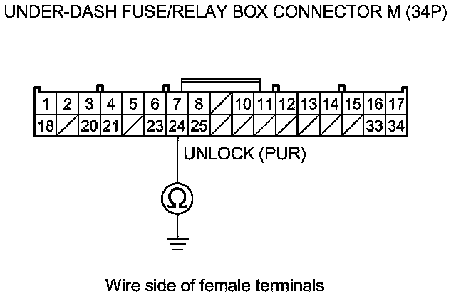 7. Check for continuity between under-dash fuse/relay box connector M (34P) terminal No. 24 and body ground.