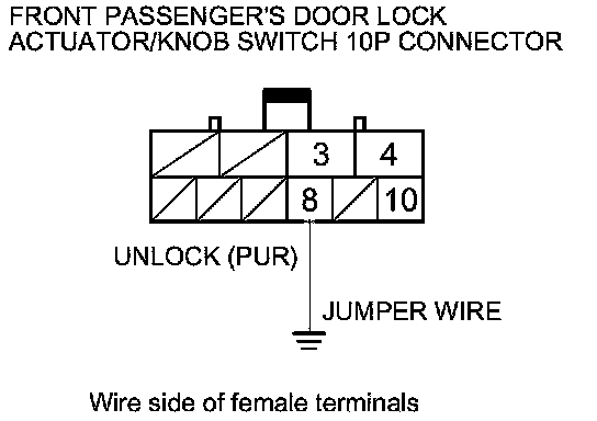 9. Connect front passenger's door lock actuator/knob switch 10P connector terminal No. 8 and body ground with a jumper wire.