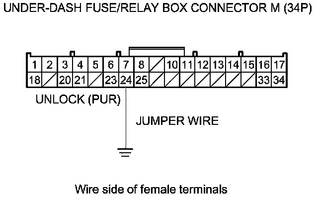 12. Connect under-dash fuse/relay box connector M (34P) terminal No. 24 and body ground with a jumper wire.