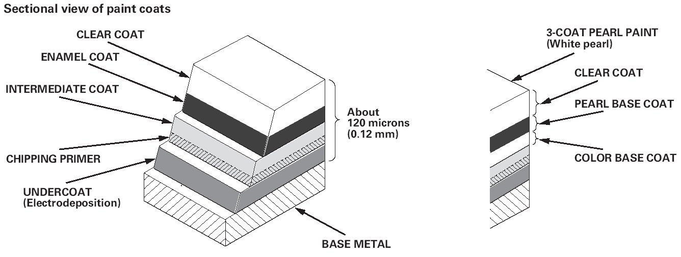 Enamel paint and either polyester or acrylic resin paint are used in the top coat for higher solidity, smoothness, brightness, and weather resistance.