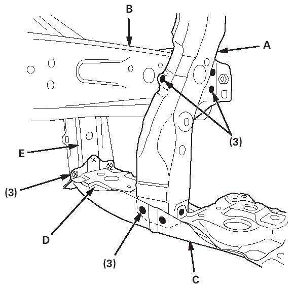 Weld the bulkhead side stay (A) to the front side frame (B), and the bulkhead lower crossmember (C). Weld the lower crossmember stiffener (D) and the wheelhouse lower extension (E).