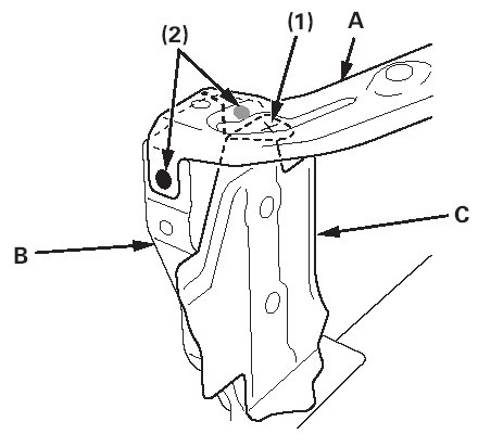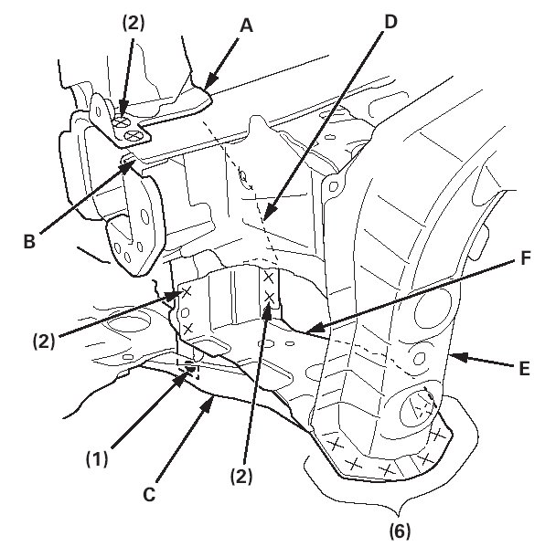 6. Weld the bumper beam bracket (A) and the front side frame (B). Weld the bulkhead lower crossmember (C) to the bulkhead side stay (D), and the wheelhouse lower member (E). Weld the lower crossmember stiffener (F) and the bulkhead side stay.