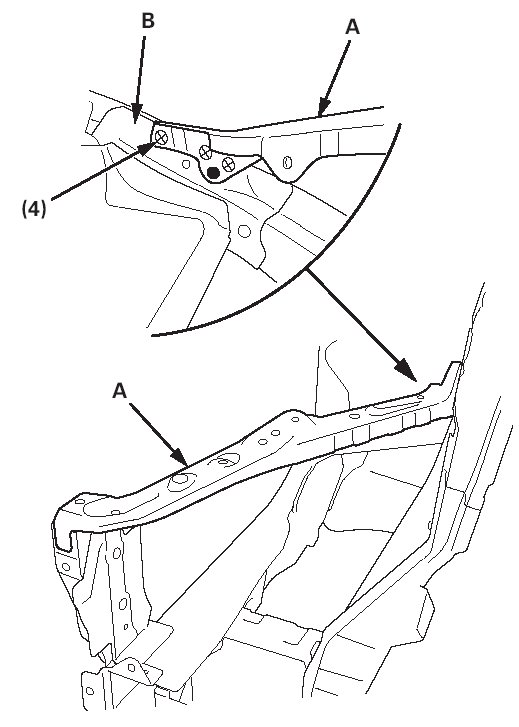 8. Weld the bulkhead upper side frame (A) and the wheelhouse lower extension (B).