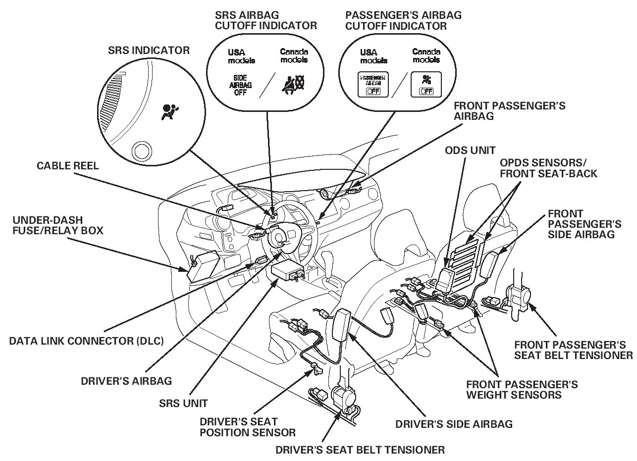 This model has an SRS which includes a driver s airbag in the steering wheel hub, a passenger s airbag in the dashboard above the glove box, the seat belt tensioners in the front seat belt retractors, the side airbags in the front seat-backs, and the side curtain airbags in the sides of the roof. The SRS unit is separate from the airbag assembly and has built-in sensors. The following precautions should be observed when doing sheet metal work, paint work, and repair work around the locations of the SRS components.