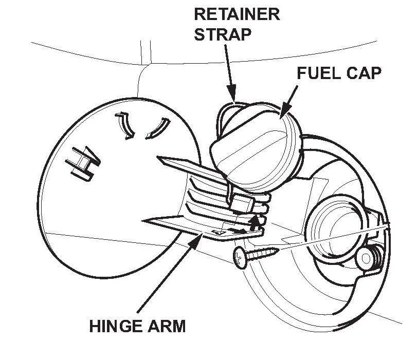 2. Remove the fuel fill cap, then remove the fuel fill cap retainer strap from the hinge arm. Remove the screw from the fuel fill door/adapter.