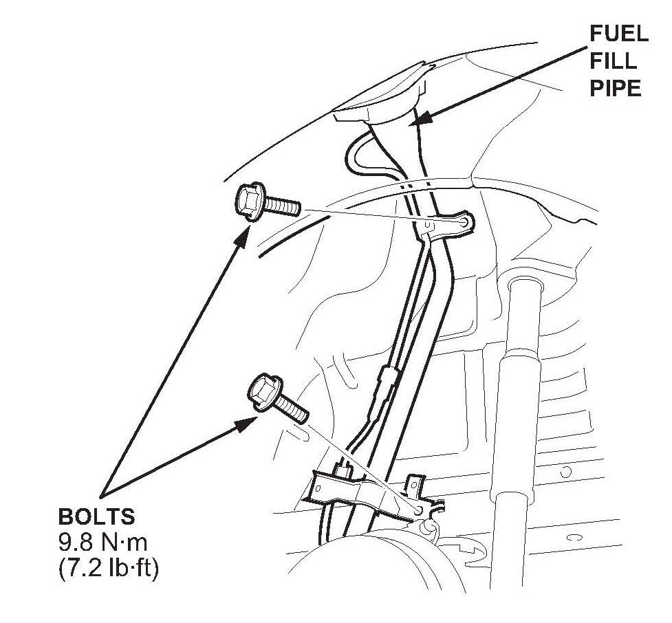 3. Remove the bolts, then lower the fuel fill pipe.