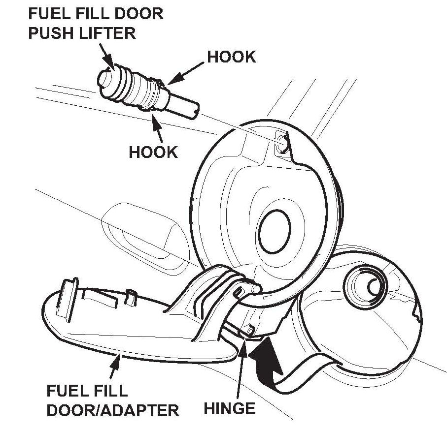 6. Install the new push lifter, then reinstall the fuel fill door/adapter and the fuel fill cap.