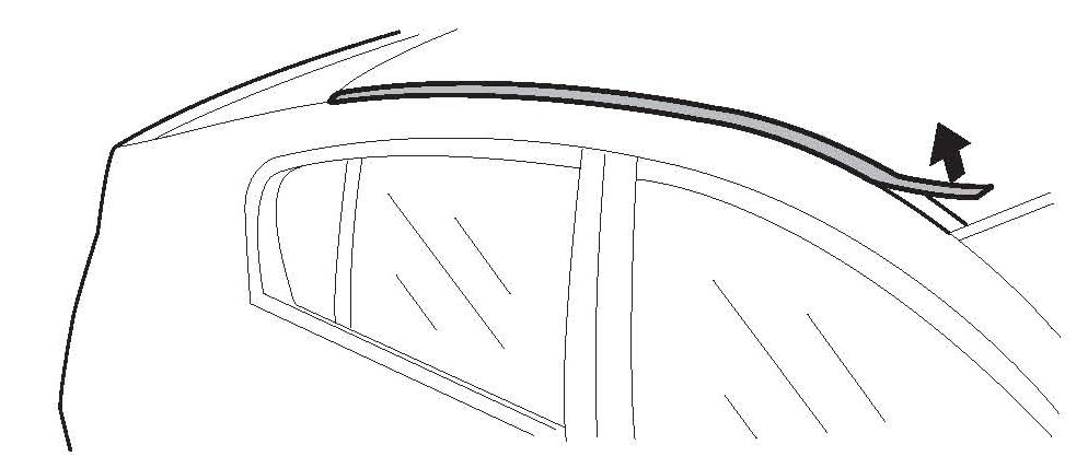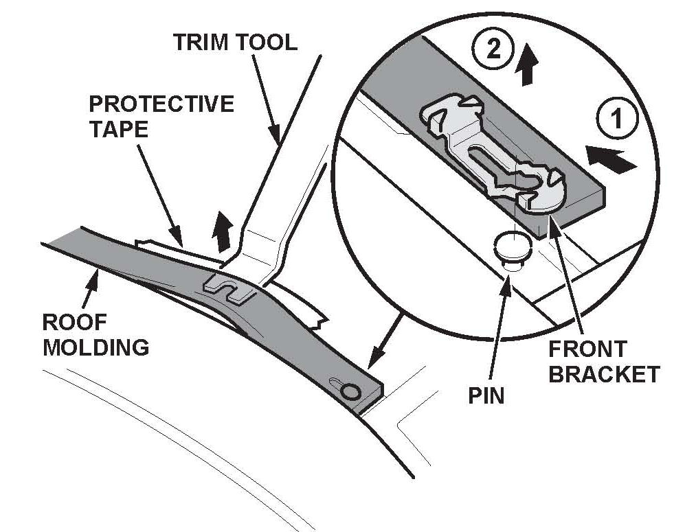 2. Using the appropriate trim tool, pull up and slide the roof molding rearward to release the front bracket from the pin on the body.