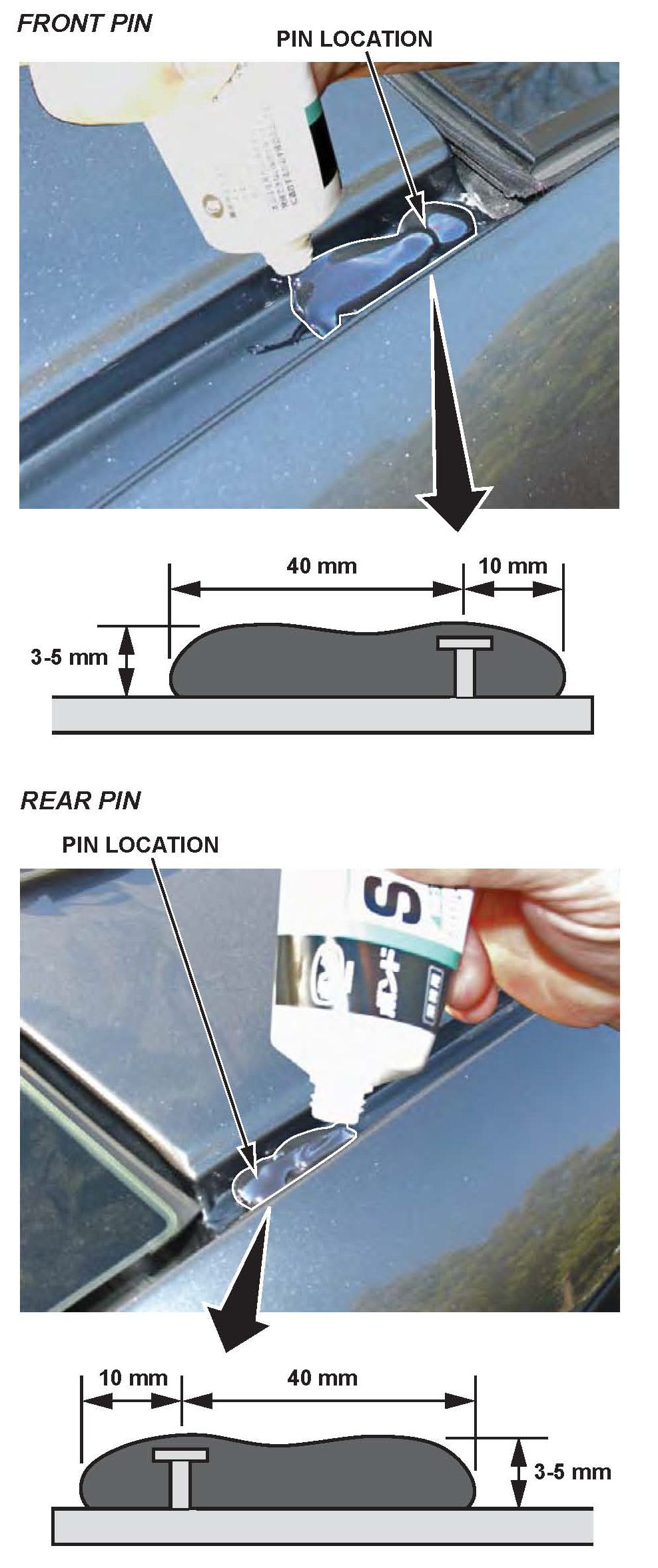 8. Apply a 50 mm bead of Konishi Bond to the front and rear pins as shown until the pins on the body are completely covered.