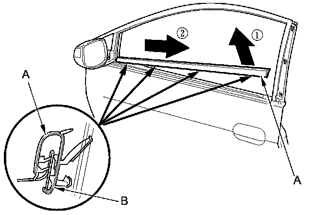 3. Pull up the rear edge of the door glass outer weatherstrip (A), and detach the hooks (B). Slide the weatherstrip rearward, then remove it.