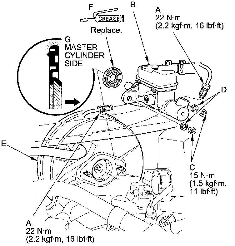 NOTE: During installation, set the new rod seal onto the master cylinder with its grooved side (G) toward the master cylinder.