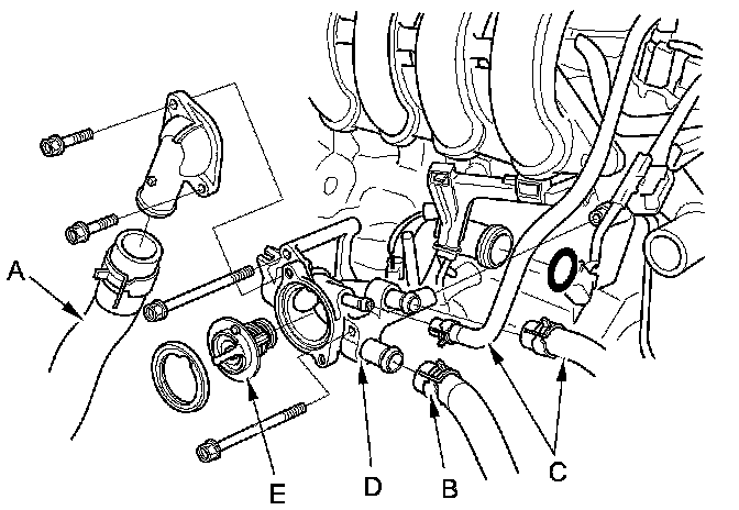 5. Remove the thermostat housing assembly (D), then remove the thermostat (E).