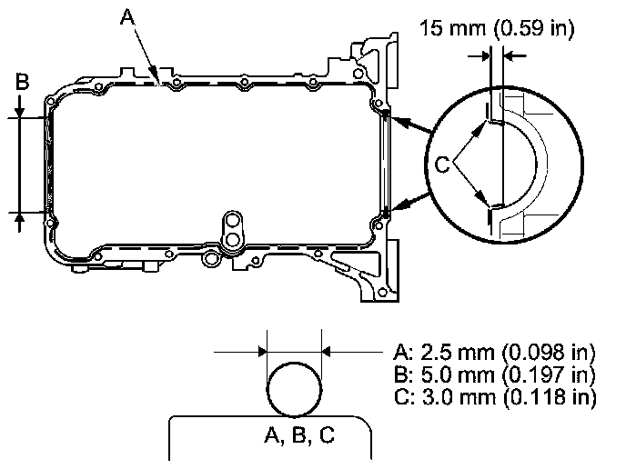 - Apply a 3.0 mm (0.118 in) diameter bead of liquid gasket to the broken line (C).