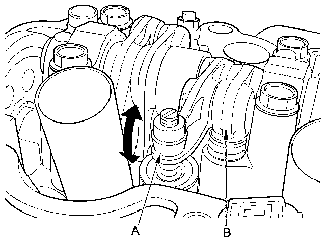 10. Move the intake secondary rocker arm (A) for the No. 1 cylinder. The intake secondary rocker arm should move independently of the intake primary rocker arm (B):