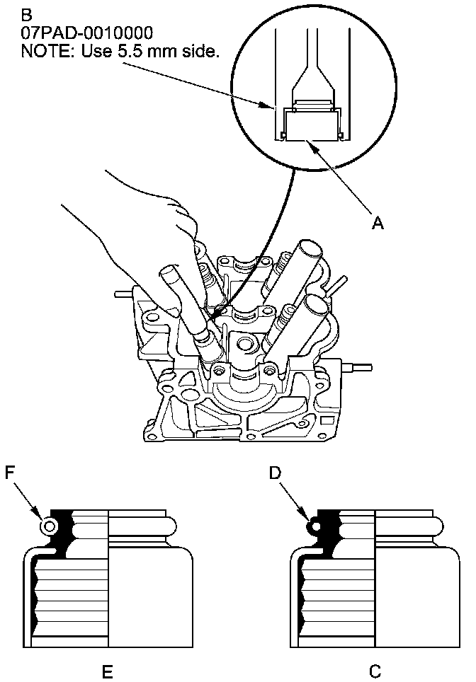 NOTE: The exhaust valve seal (C) have a black spring (D) and intake valve seal (E) have a white spring (F); they are not interchangeable.
