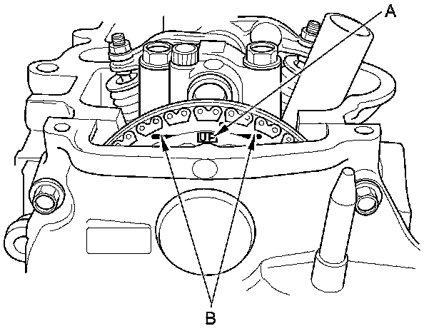 2. Set the No. 1 piston at top dead center (TDC). The "UP" mark (A) on the camshaft sprocket should be at the top, and the TDC grooves (B) on the camshaft sprocket should line up with the top edge of the head.