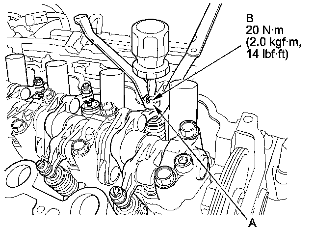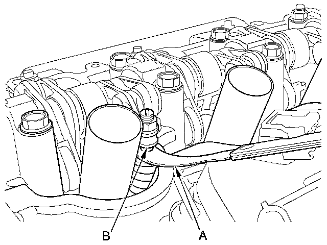 4. Insert the feeler gauge (A) between the adjusting screw (B) and the end of the valve stem on No. 1 cylinder, and slide it back and forth; you should feel a slight amount of drag.