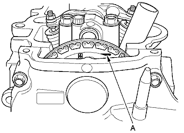 9. Rotate the crankshaft clockwise. Align the No. 4 piston TDC groove (A) on the camshaft sprocket with the top edge of the head.