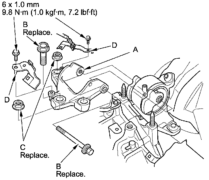 5. Install the transmission mount bracket (A), and loosely install the new transmission mount bracket mounting bolts (B) and nuts (C).