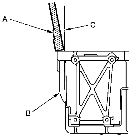 - Apply a 3.0 mm (0.118 in) diameter bead of liquid gasket to the upper surface contact areas of the engine block (B).