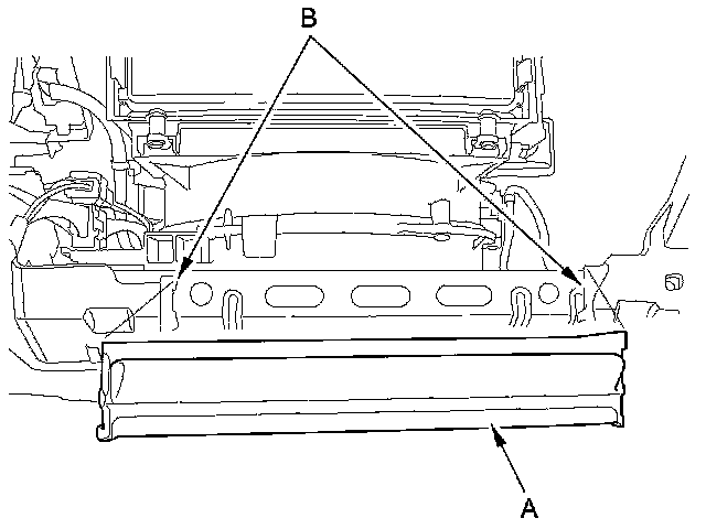 2. Cut the plastic cross brace (A) in the glove box opening with diagonal cutters in the area (B), and discard it.