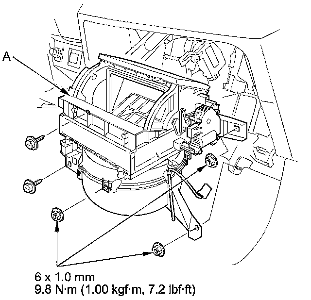 6. Remove the self-tapping screws, the mounting nuts, and the blower unit (A).