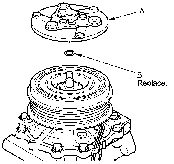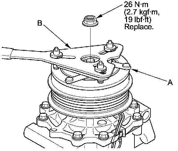1. Remove the center nut while holding the armature plate (A) with the A/C clutch holder (B).