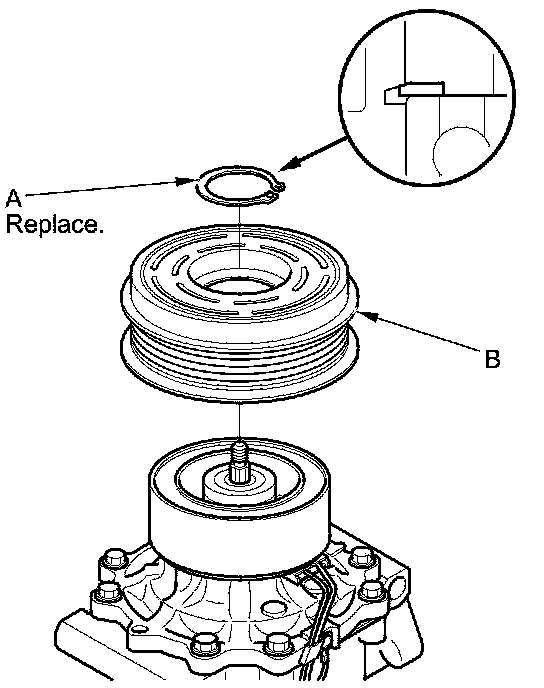 3. If you are replacing the field coil, remove the snap ring (A) with snap ring pliers, then remove the rotor pulley (B). Be careful not to damage the rotor pulley and A/C compressor.