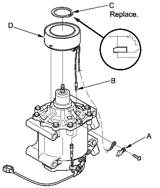 4. Remove the bolt and holder (A), then disconnect the field coil connector (B). Remove the snap ring (C) with snap ring pliers, then remove the field coil (D). Be careful not to damage the field coil and A/C compressor.