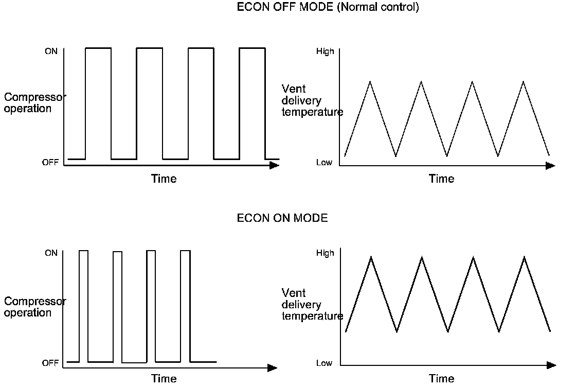 Compared to the ECON OFF Mode, the climate control unit shortens the A/C compressor operation time, which reduces power consumption.