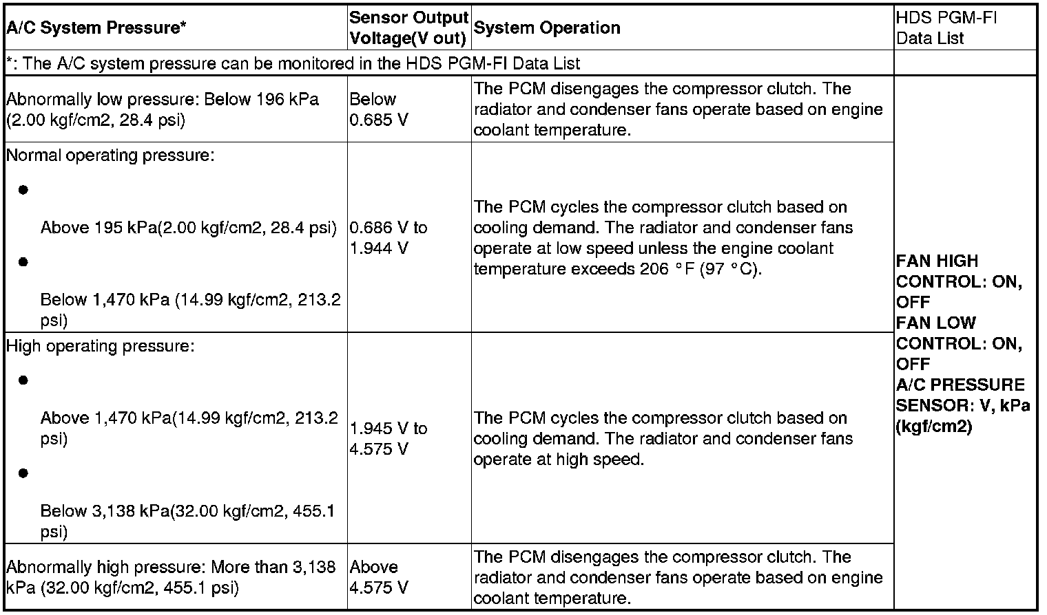 HDS PGM FI Data List Information (as it relates to A/C)