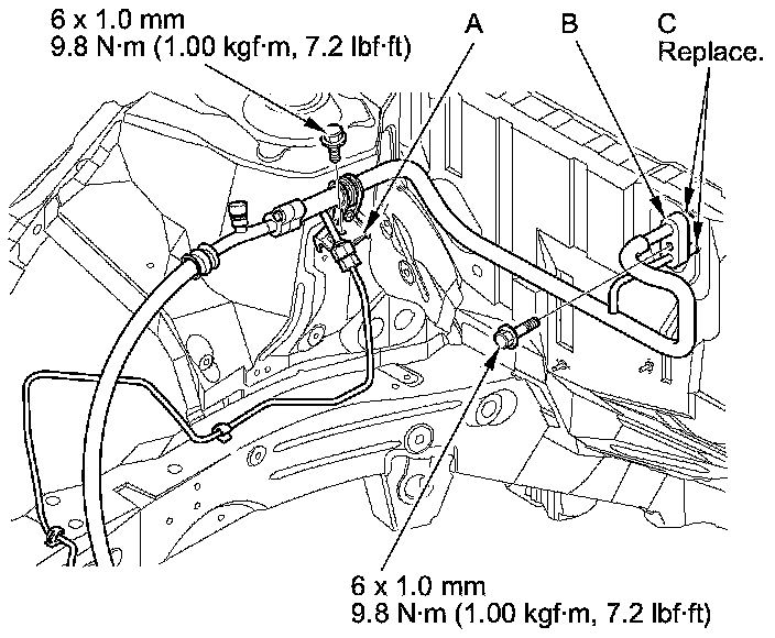 4. Remove the bolt, then disconnect the A/C line (B) from the evaporator core and remove the O-rings (C).