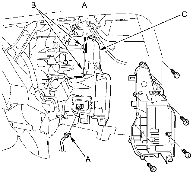 7. Disconnect the connectors (A) from the evaporator temperature sensor and the power transistor, then remove the connector clips (B). Remove the self-tapping screws, the expansion valve cover (C), and the seal.