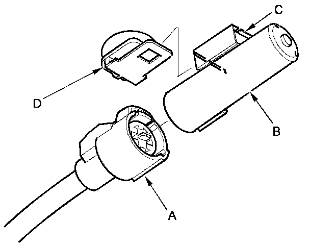 4. Lift the tab (C) to release the lock, then remove the outside air temperature sensor (B) from the clip (D).