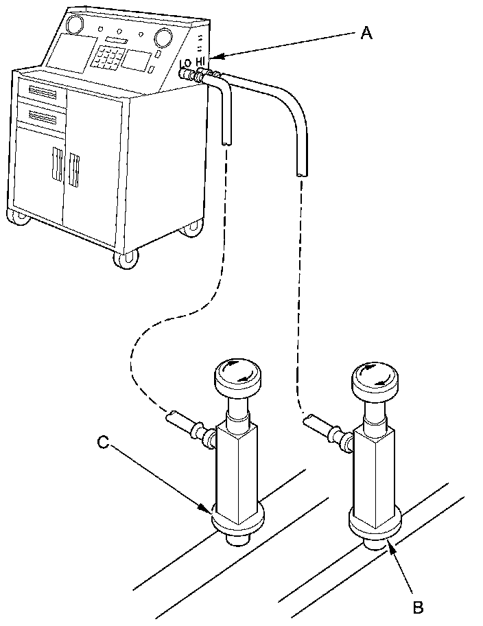 2. Connect an R-134a refrigerant recovery/recycling/charging station (A) to the high-pressure service port (B) and the low-pressure service port (C), as shown, following the equipment manufacturer's instructions. Recover the refrigerant, if any, from the A/C system A/C Refrigerant Recovery.