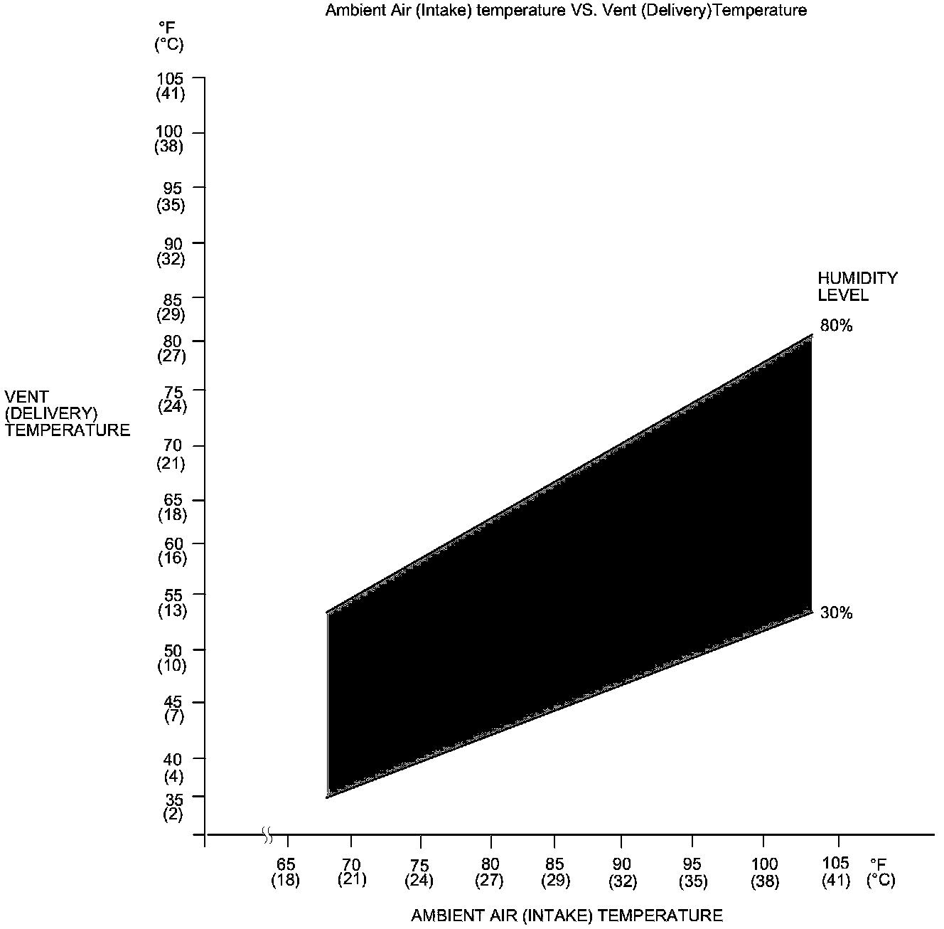 NOTE: The vent temperature and the ambient air temperature should intersect in the shaded area. Any measurements outside the area may indicate the need for further inspection.