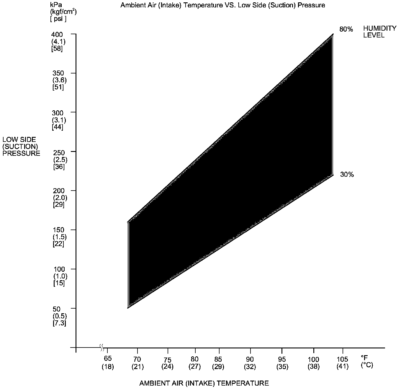 NOTE: The low side pressure and the ambient air temperature should intersect in the shaded area. Any measurements outside the area may indicate the need for further inspection.
